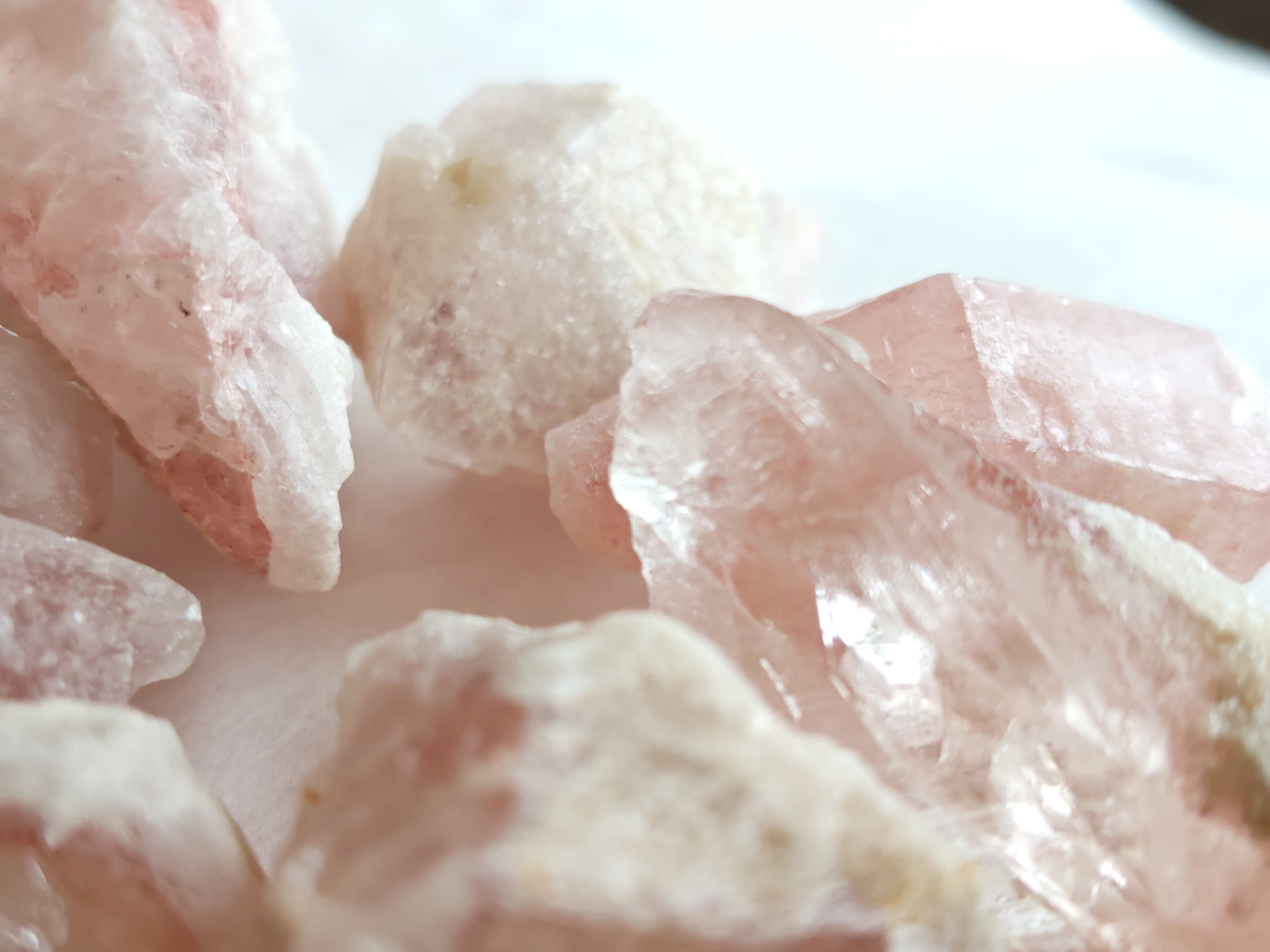 雪のように覆われた中には、酸化鉄(ex.ヘマタイト)によるピンク色の水晶が覗きます。